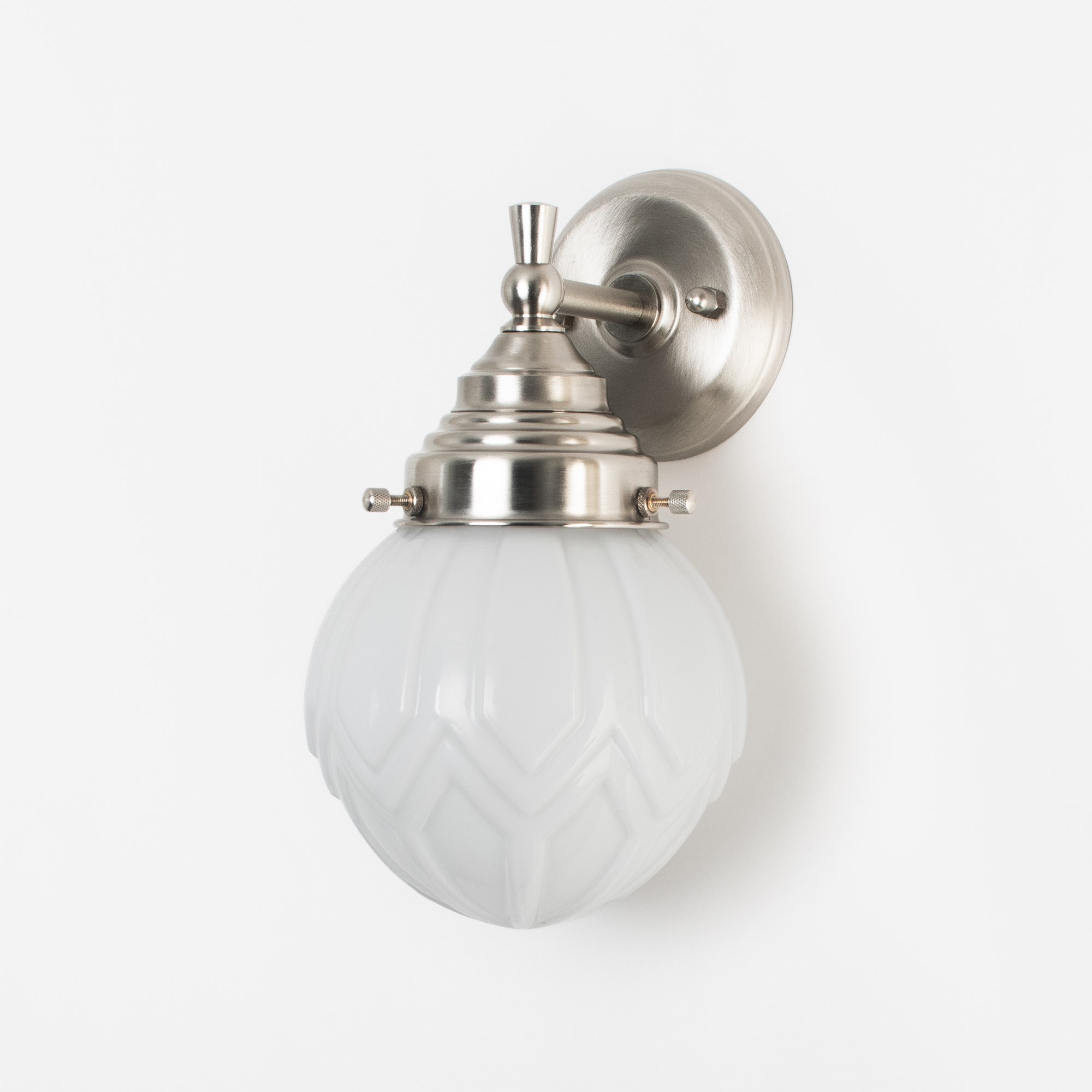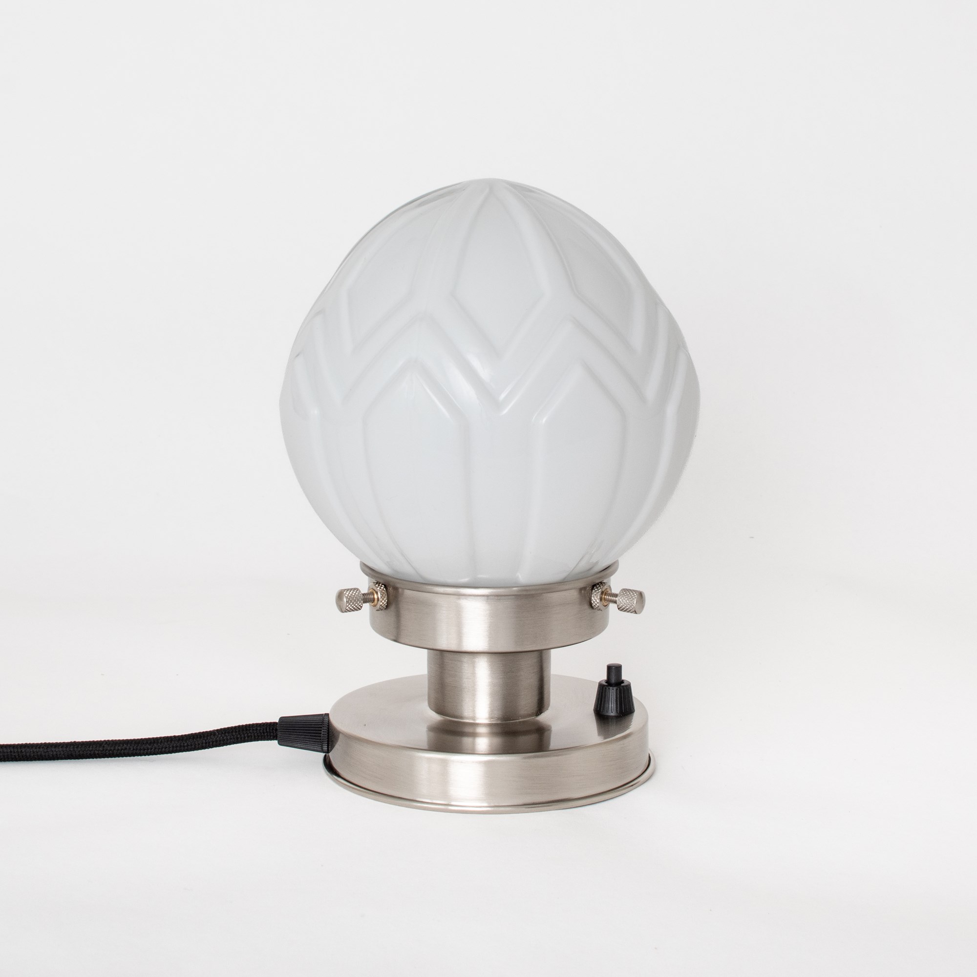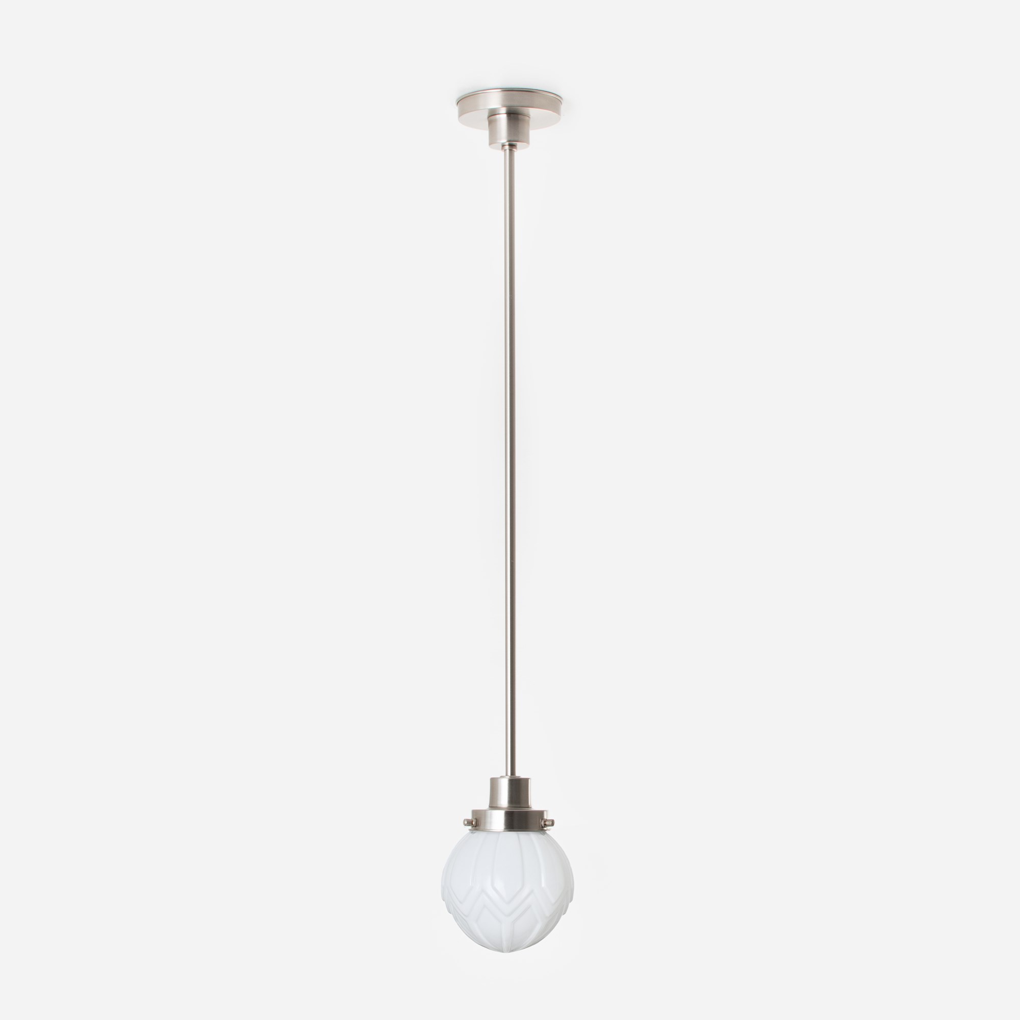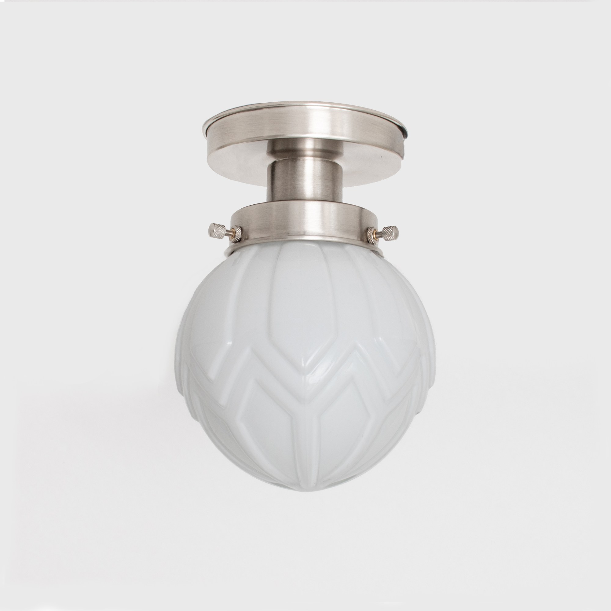 Ce modèle va conquérir de nombreux intérieurs. L'abat-jour en verre soufflé à la bouche, très réussi, est largement plébiscité, ce qui en fait un véritable coup de cœur ! Les lignes géométriques, caractéristiques du style Art déco, sont en parfaite harmonie. Verre blanc opalin.