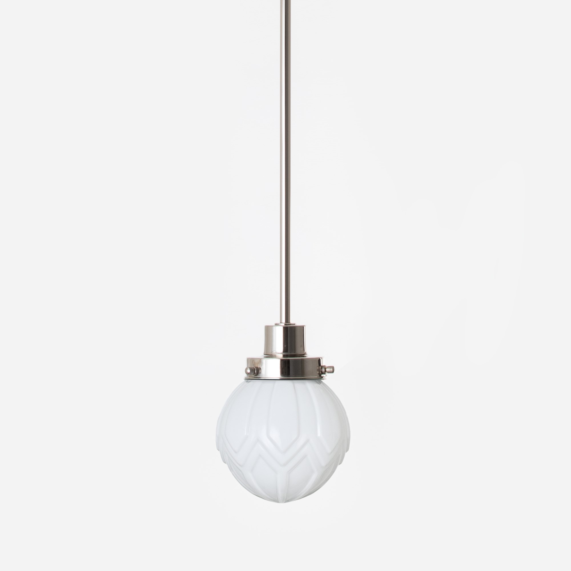 Ce modèle va conquérir de nombreux intérieurs. L'abat-jour en verre soufflé à la bouche, très réussi, est largement plébiscité, ce qui en fait un véritable coup de cœur ! Les lignes géométriques, caractéristiques du style Art déco, sont en parfaite harmonie. Verre blanc opalin.