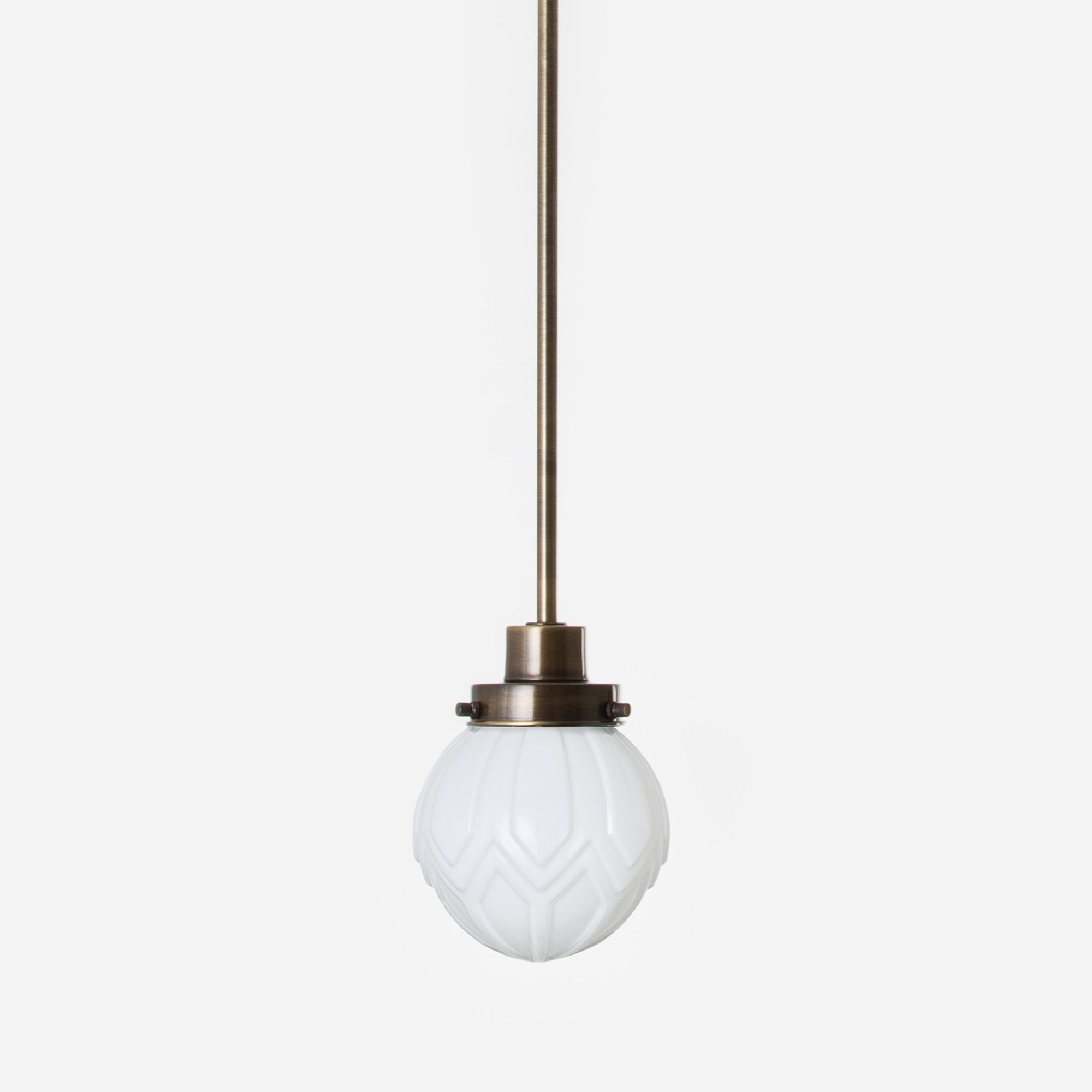 Ce modèle va conquérir de nombreux intérieurs. L'abat-jour en verre soufflé à la bouche, très réussi, est largement plébiscité, ce qui en fait un véritable coup de cœur ! Les lignes géométriques, caractéristiques du style Art déco, sont en parfaite harmonie. Verre blanc opalin.