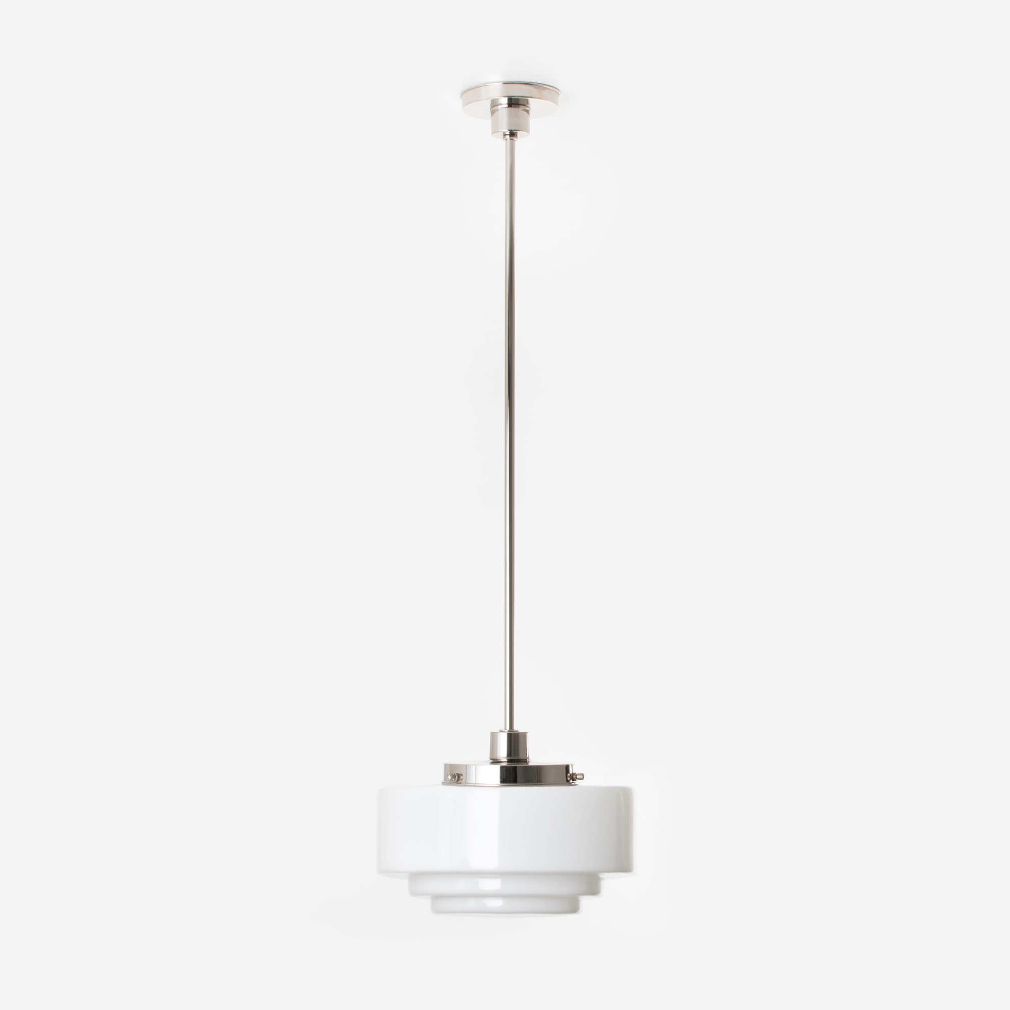 Une forme typique de l’ Art déco: un abat-jour en verre avec un large escalier en haut et de subtiles couches stratifiées en bas. Soufflé à la bouche en verre blanc opalin.