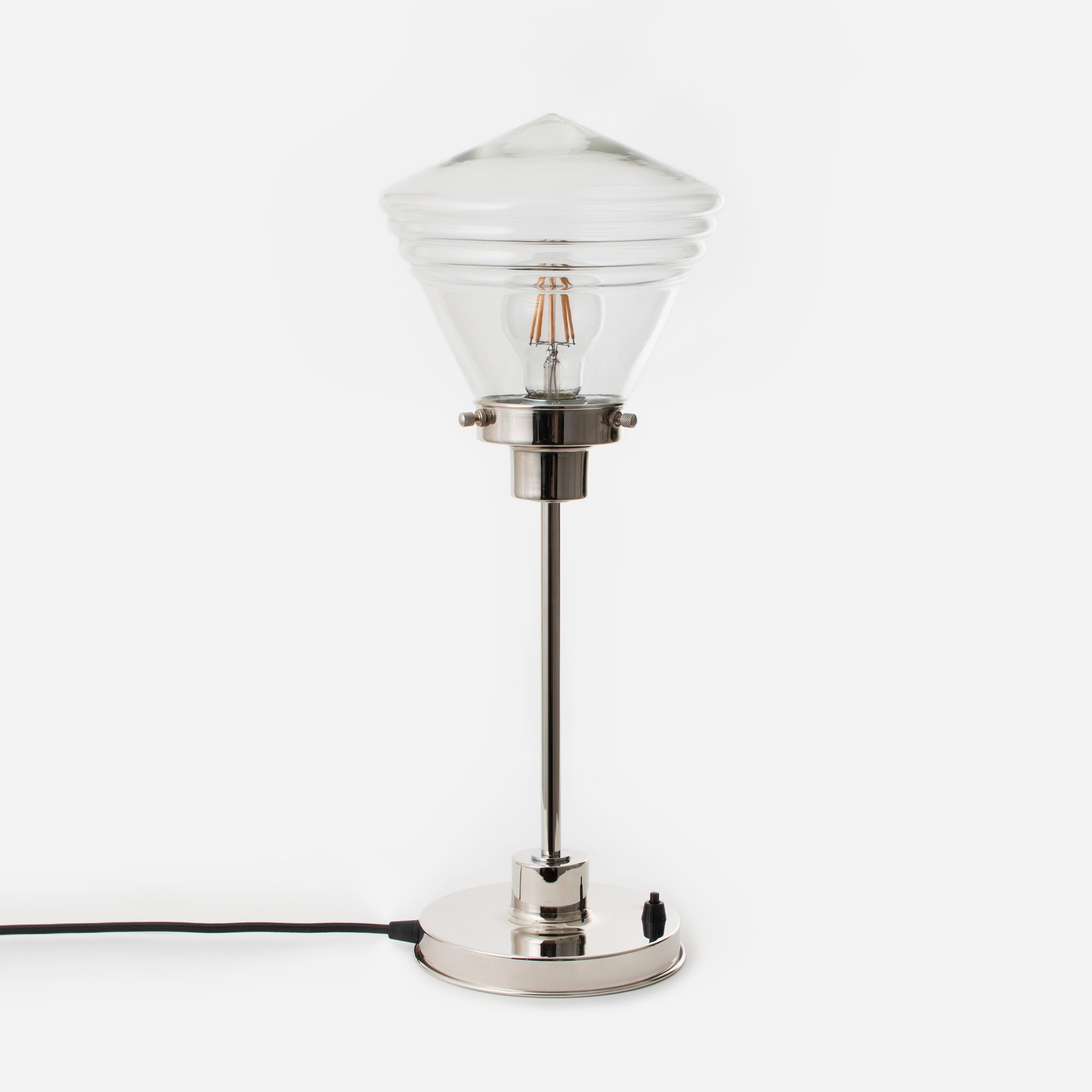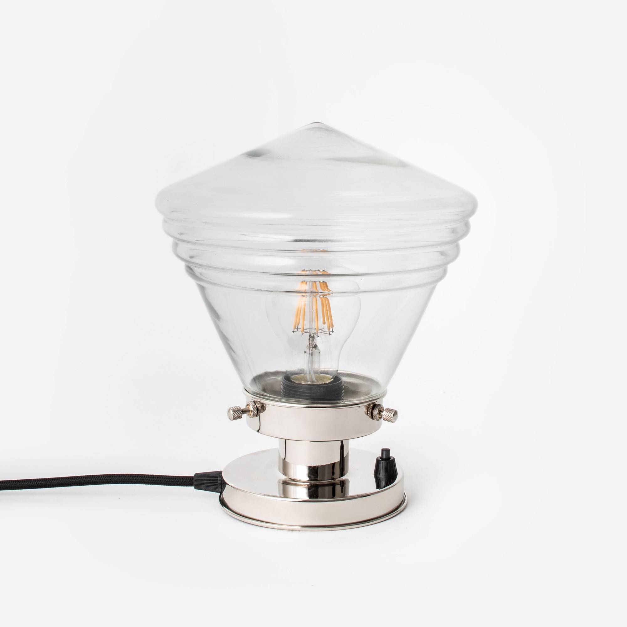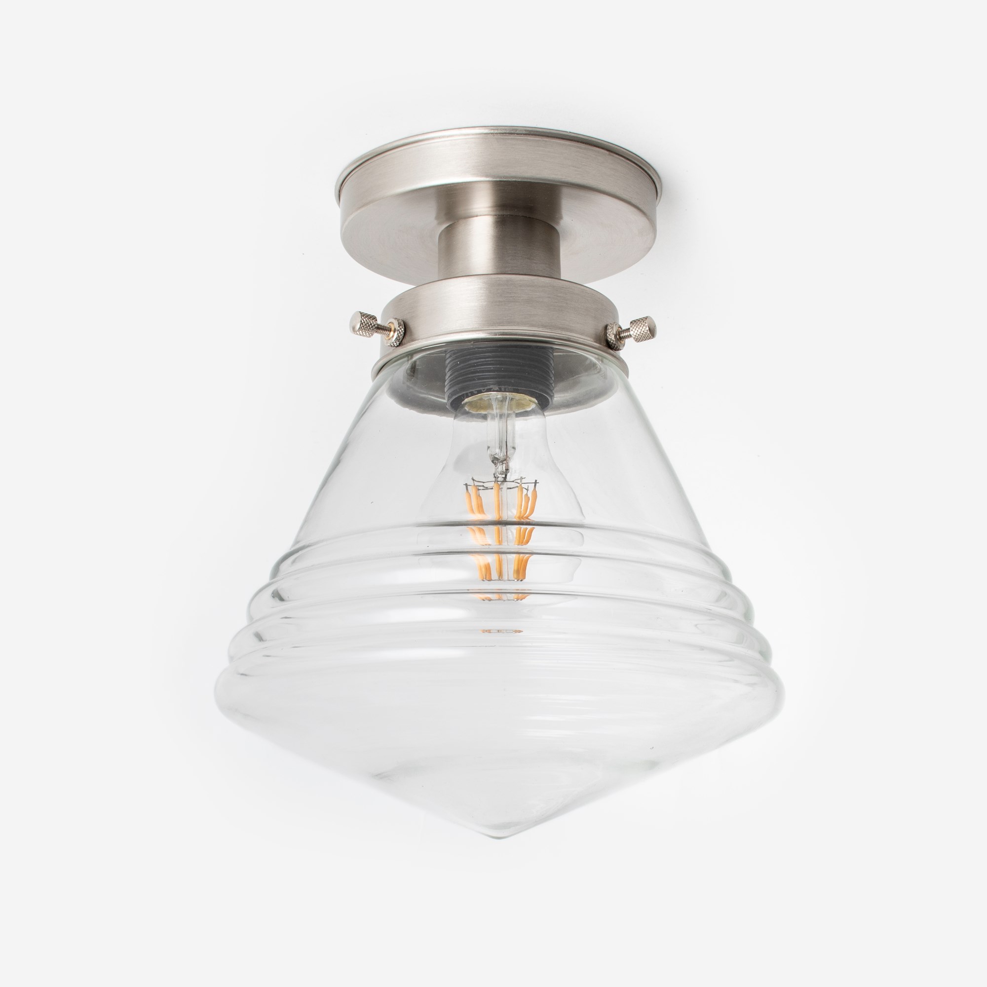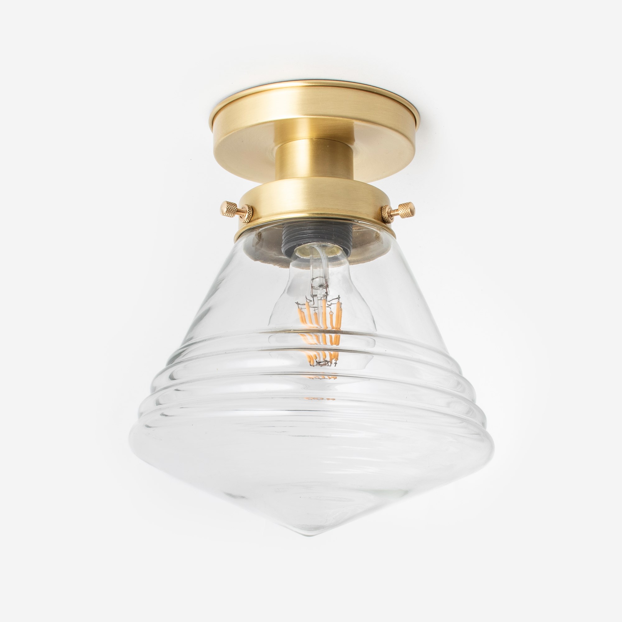 Un abat-jour Art Deco transparent au design épuré. Le verre est soufflé à la bouche et de forme conique. L'abat-jour est effilé et présente des détails côtelés subtils. Verre transparent.