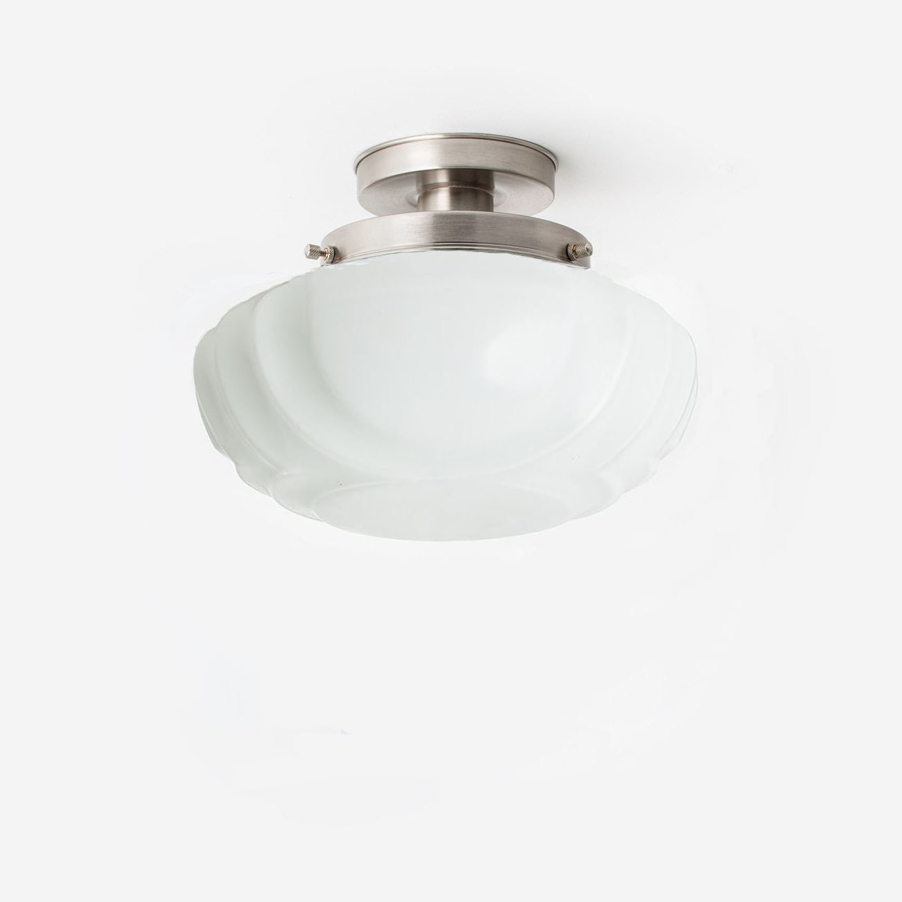 Abat-jour en verre de style Art nouveau aux formes asymétriques et changeantes. Les lignes gracieuses et lisses donnent un effet ludique. Verre blanc opalin.