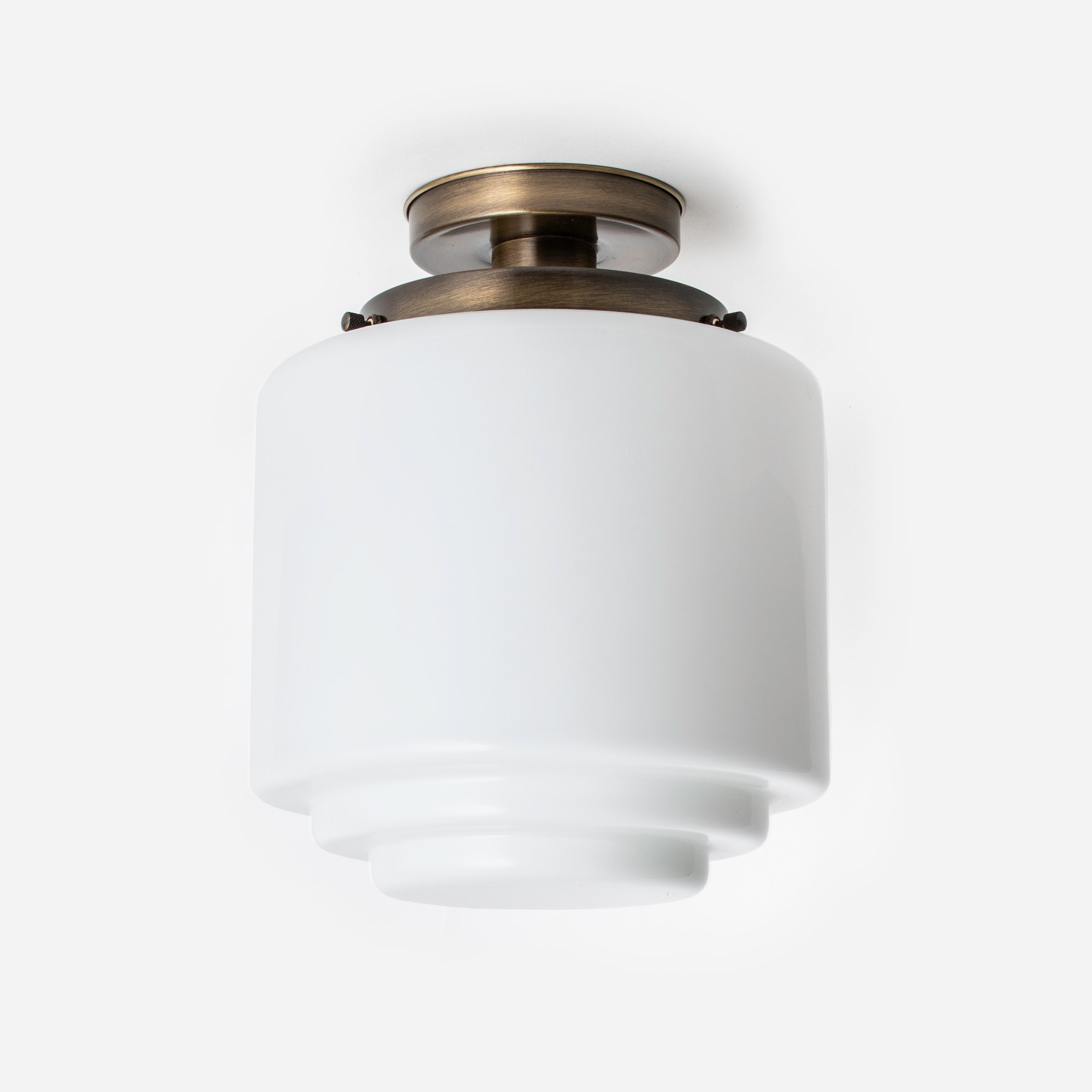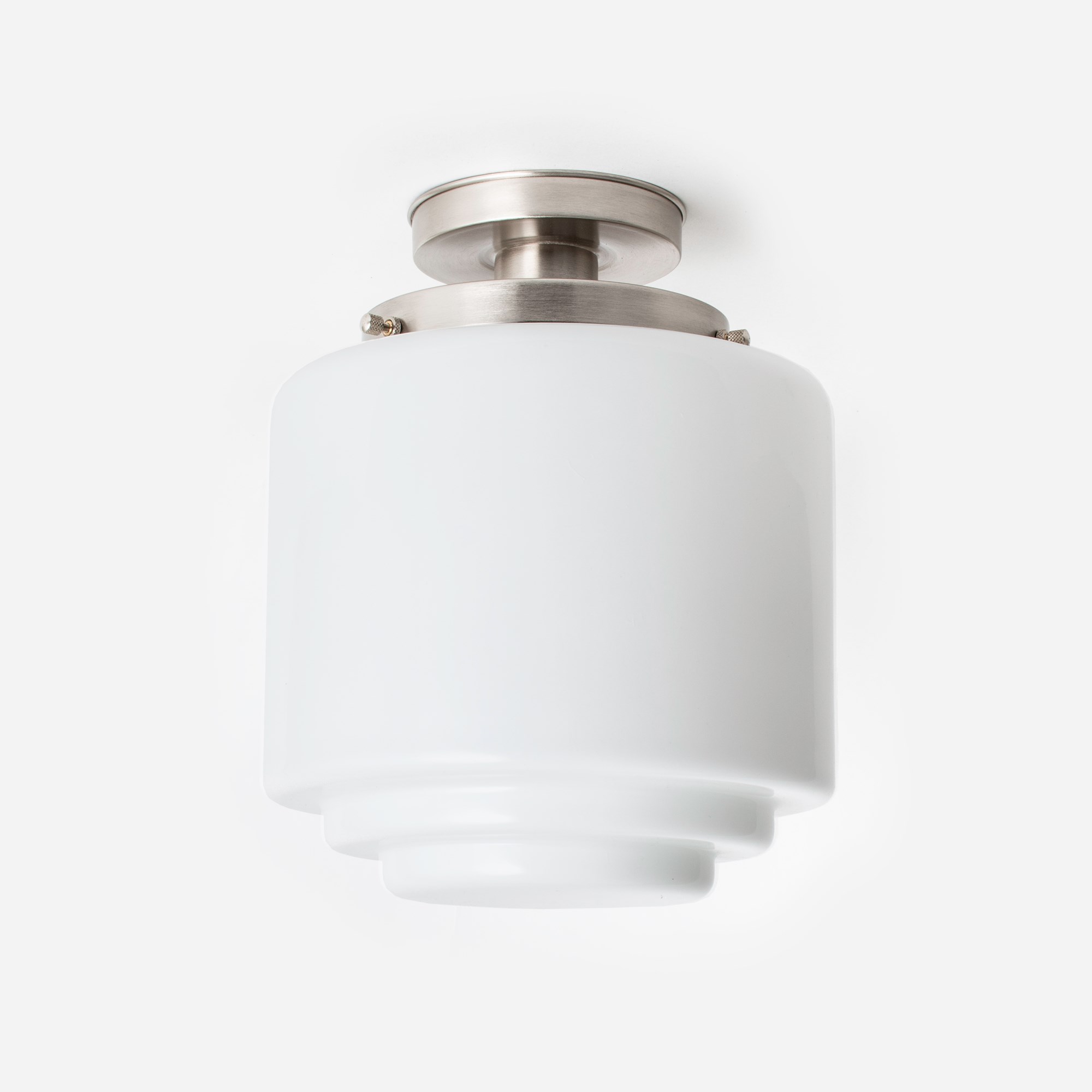 La forme en escalier est typique du style Art déco. Ici, elle est associée à une forme géométrique cylindrique. Soufflé à la bouche en verre blanc opalin.