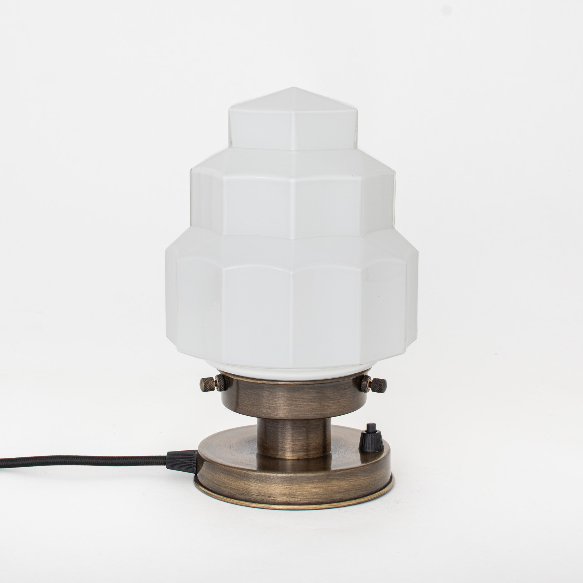 Spectaculaire abat-jour en verre Art Déco soufflé à la bouche. Les sols sont constitués de formes angulaires et géométriques. Verre blanc opale.