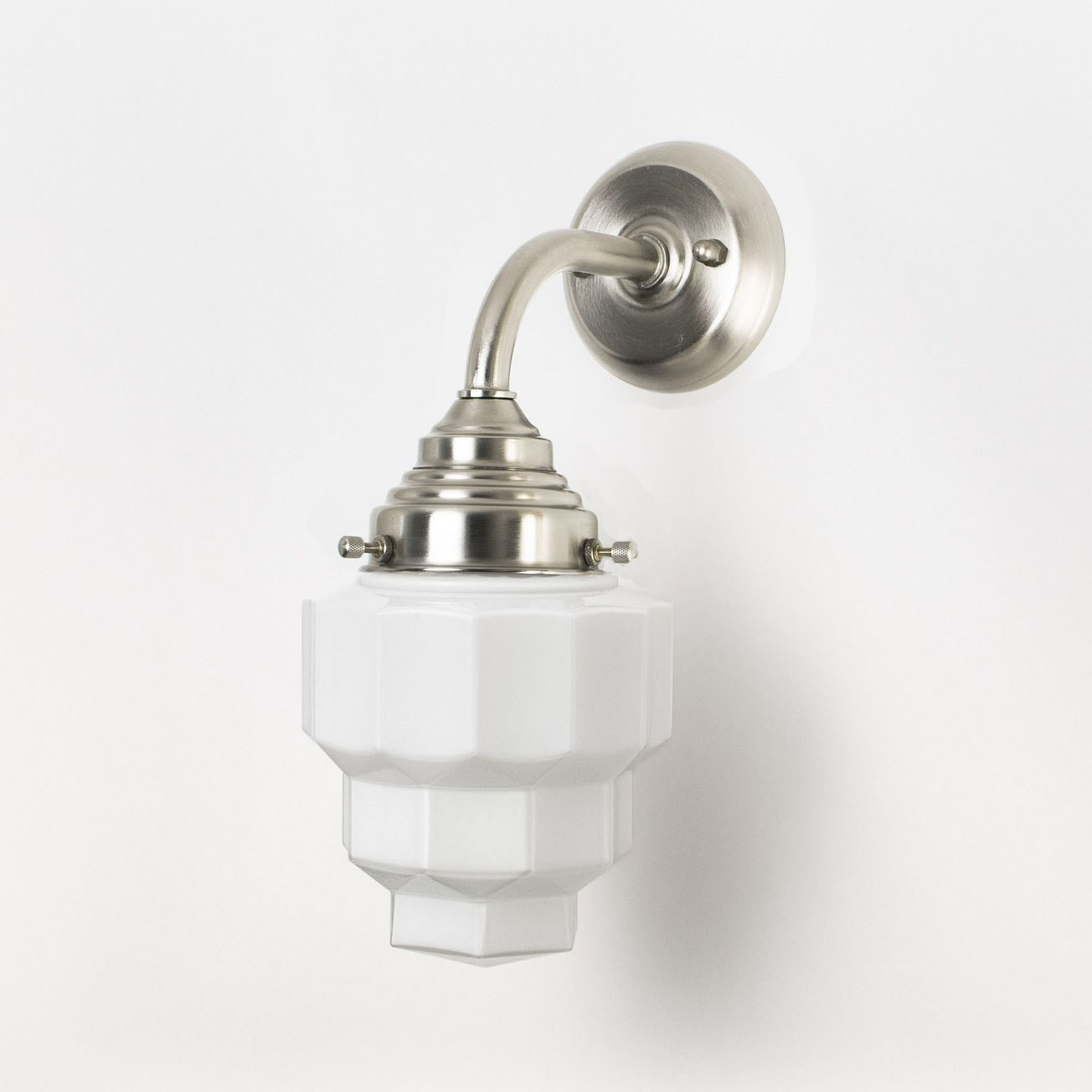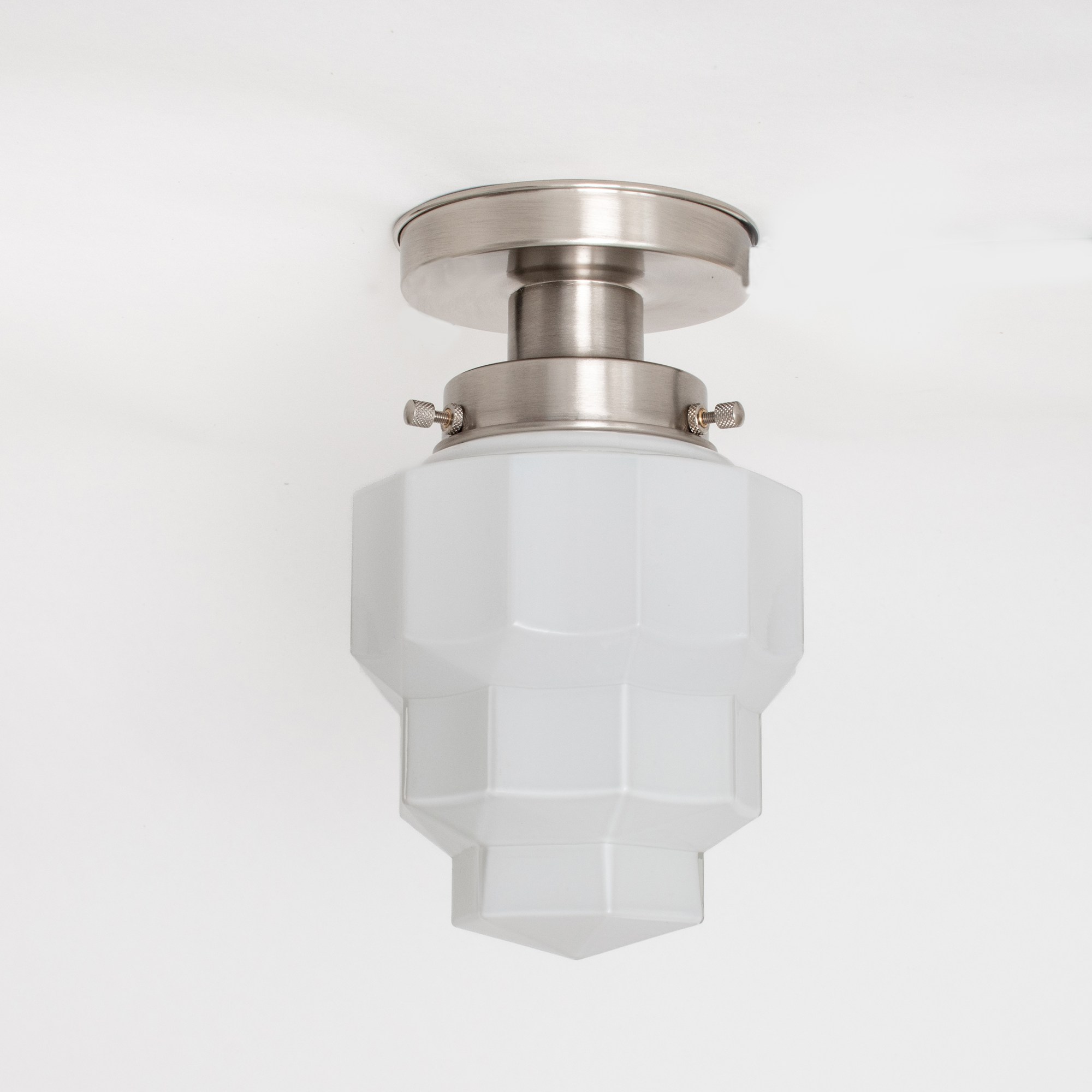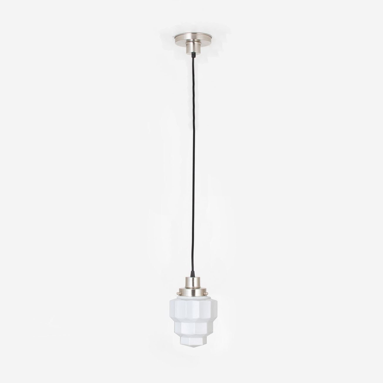 Spectaculaire abat-jour en verre Art Déco soufflé à la bouche. Les sols sont constitués de formes angulaires et géométriques. Verre blanc opale.