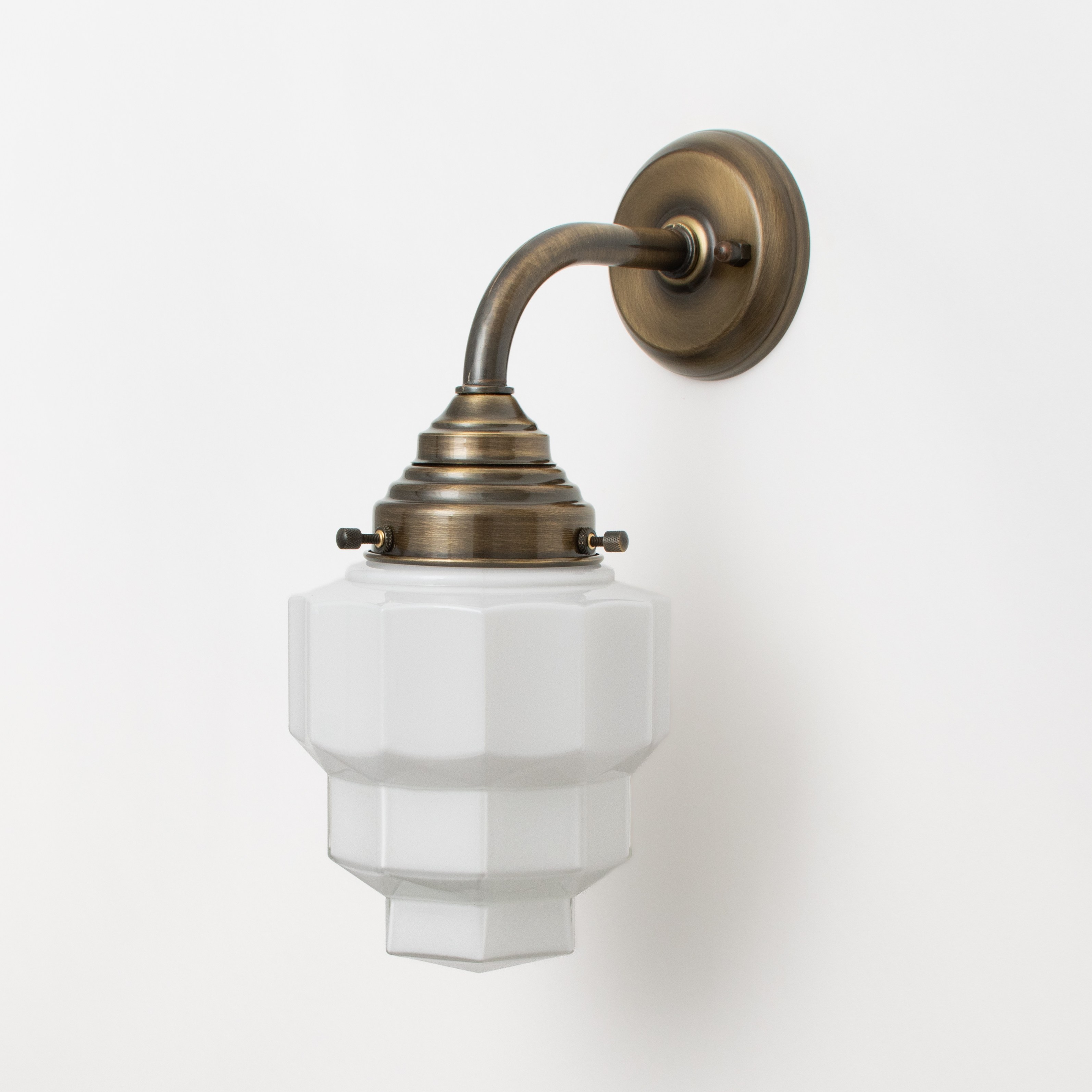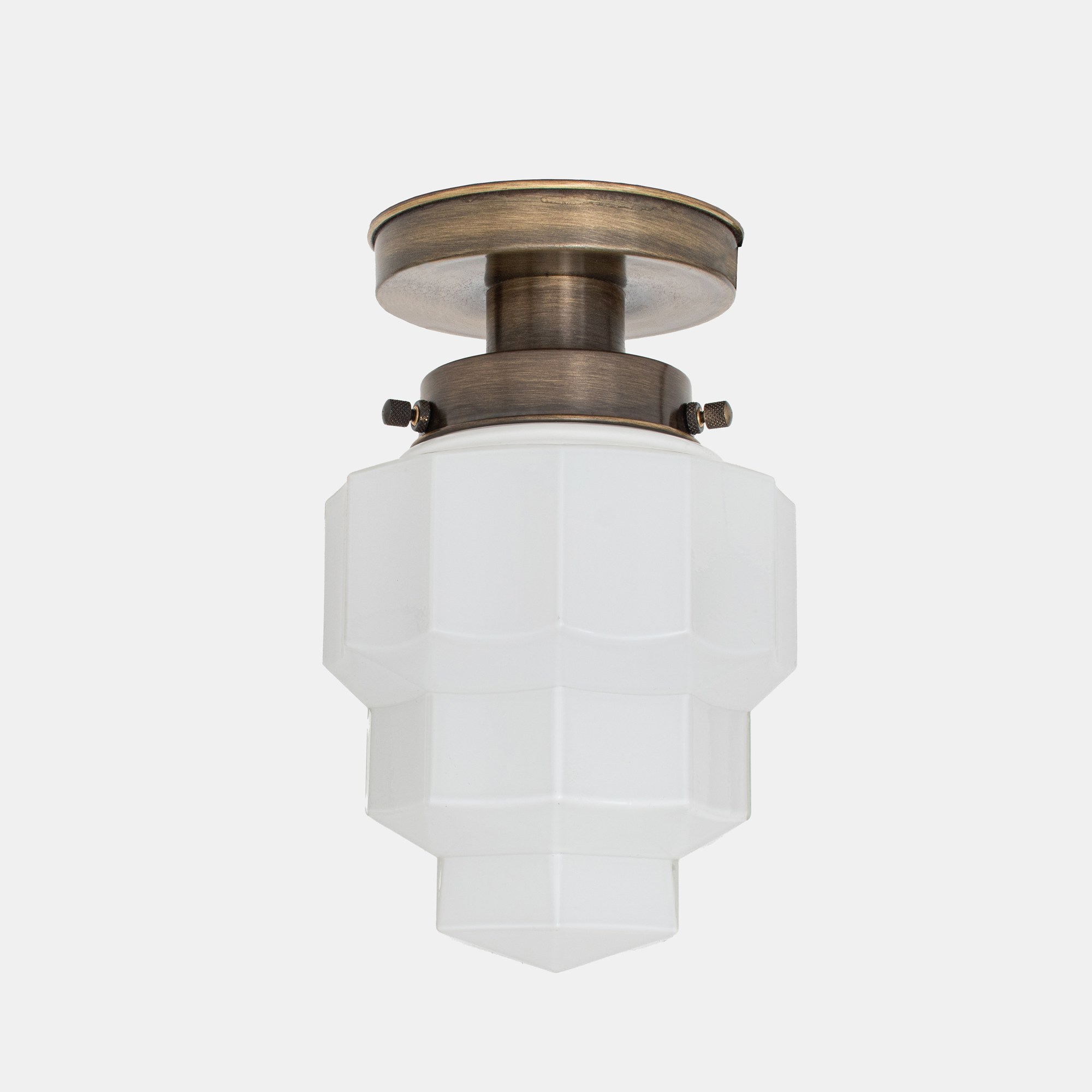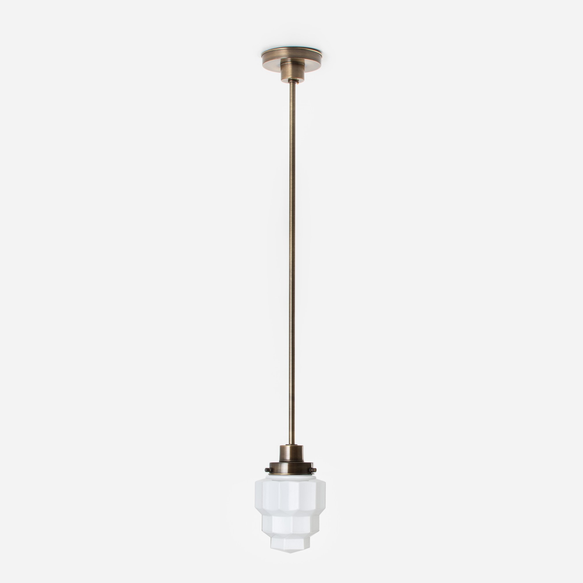 Spectaculaire abat-jour en verre Art Déco soufflé à la bouche. Les sols sont constitués de formes angulaires et géométriques. Verre blanc opale.