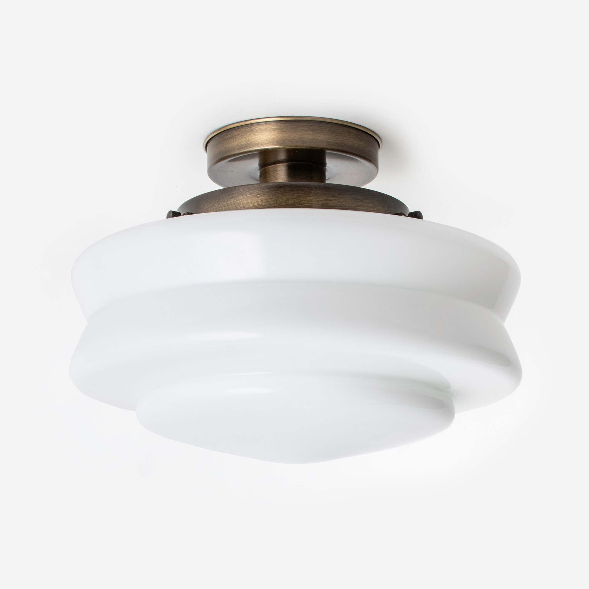 Grand abat-jour en verre en forme de toupie. La forme unique de cette lampe attire immédiatement l'attention. Verre soufflé bouche blanc opalin.