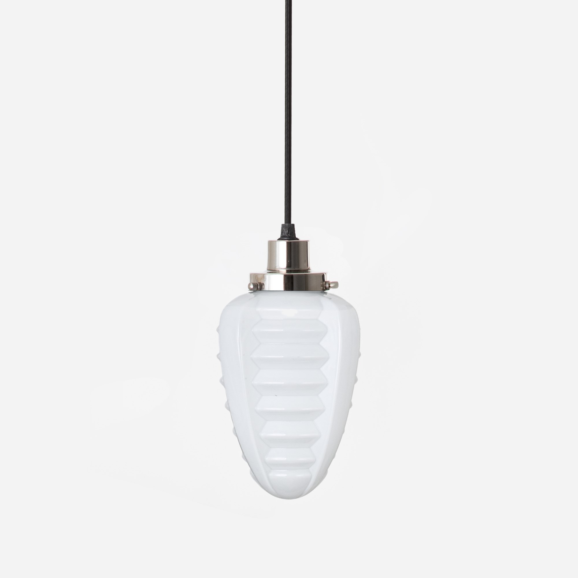 Un cordon en lin noir complété par un capuchon de plafond en métal nickelé brillant (avec un œillet de suspension, donc facile à monter au plafond).