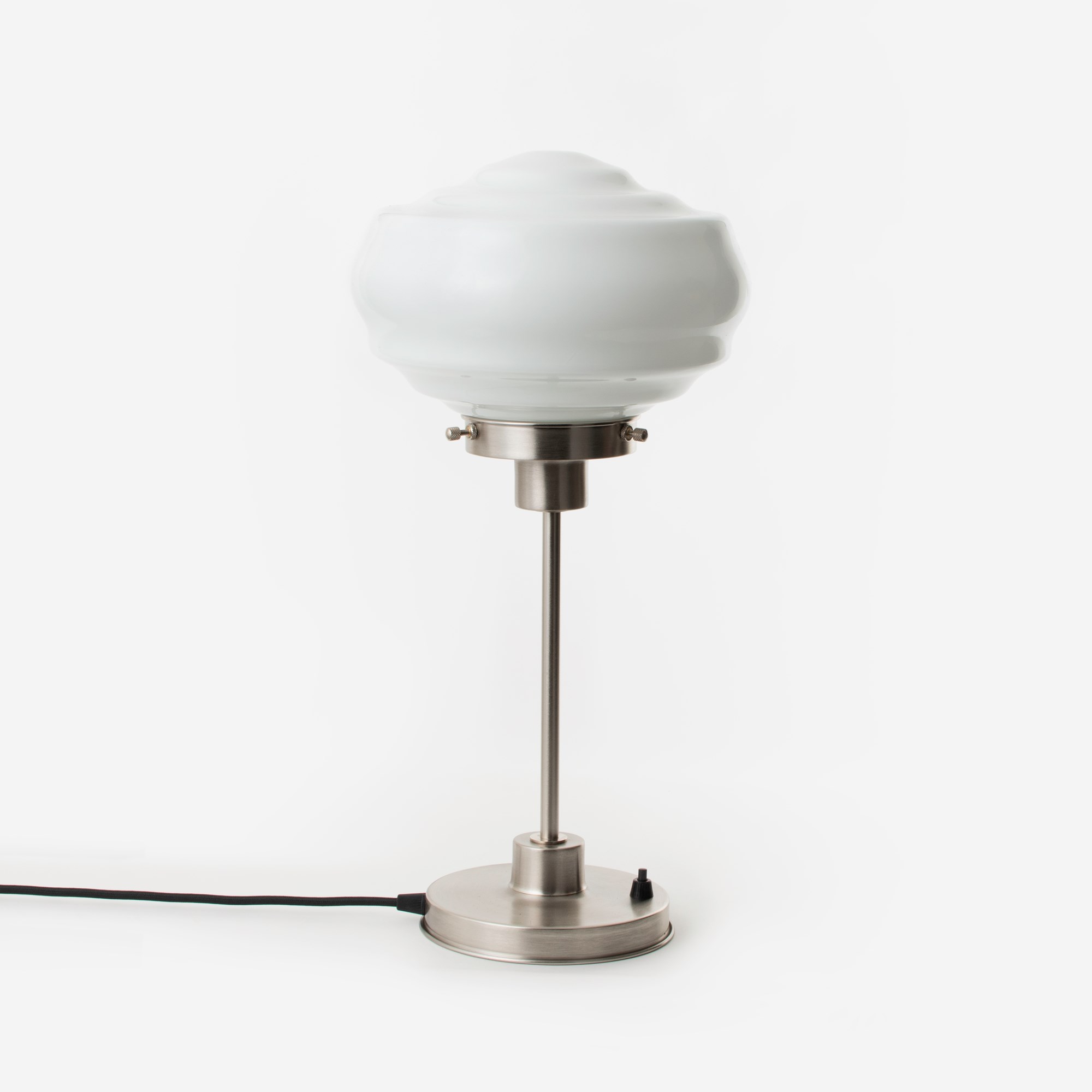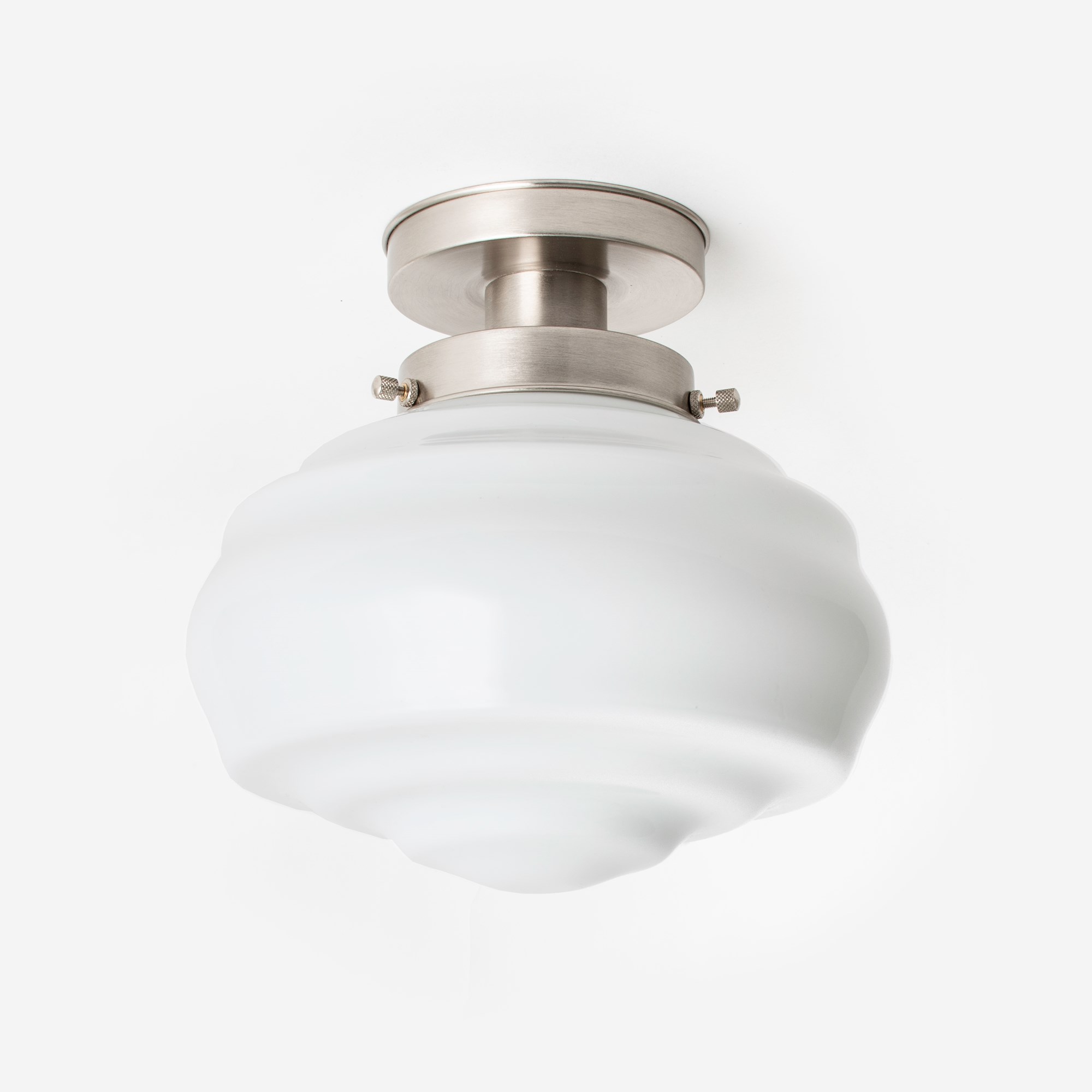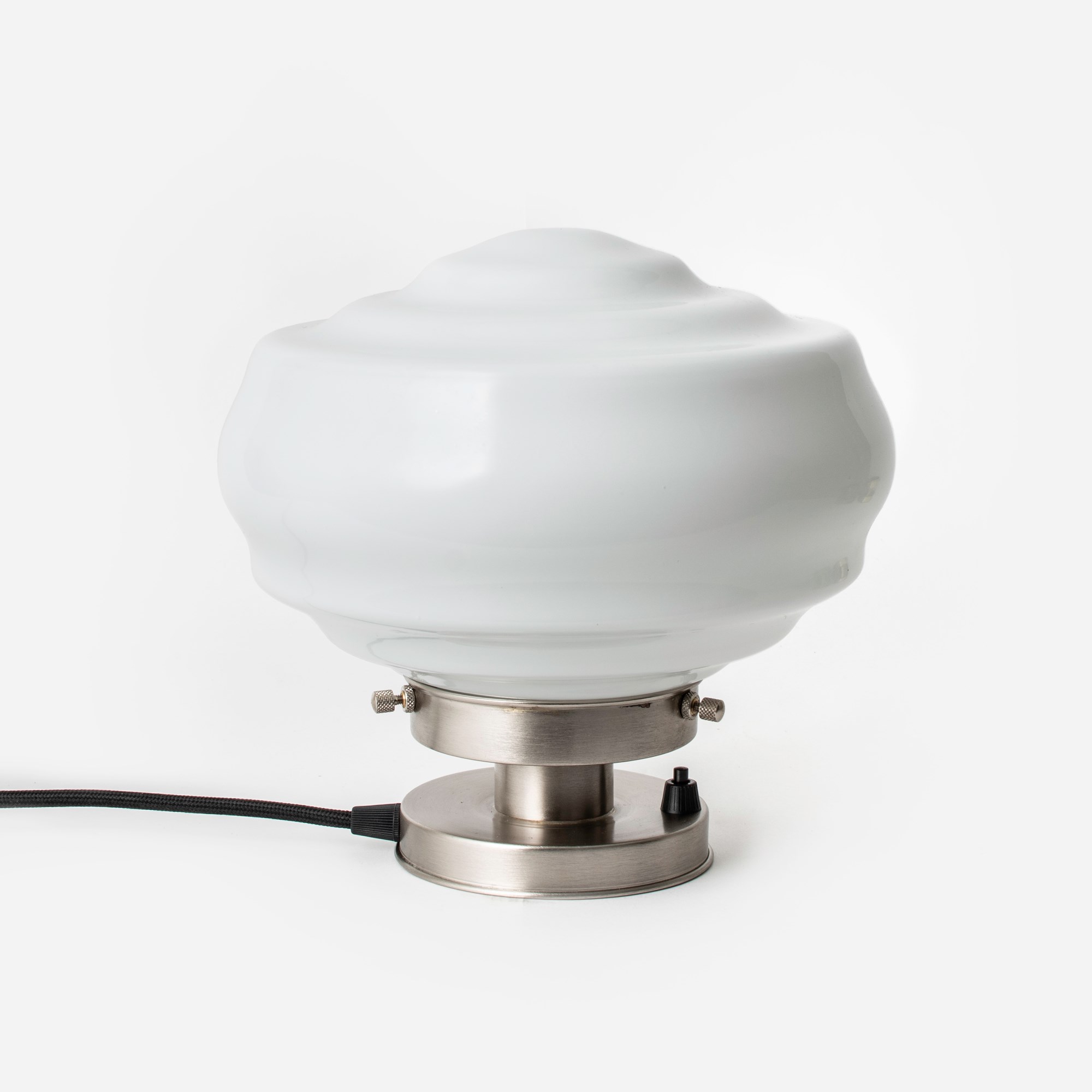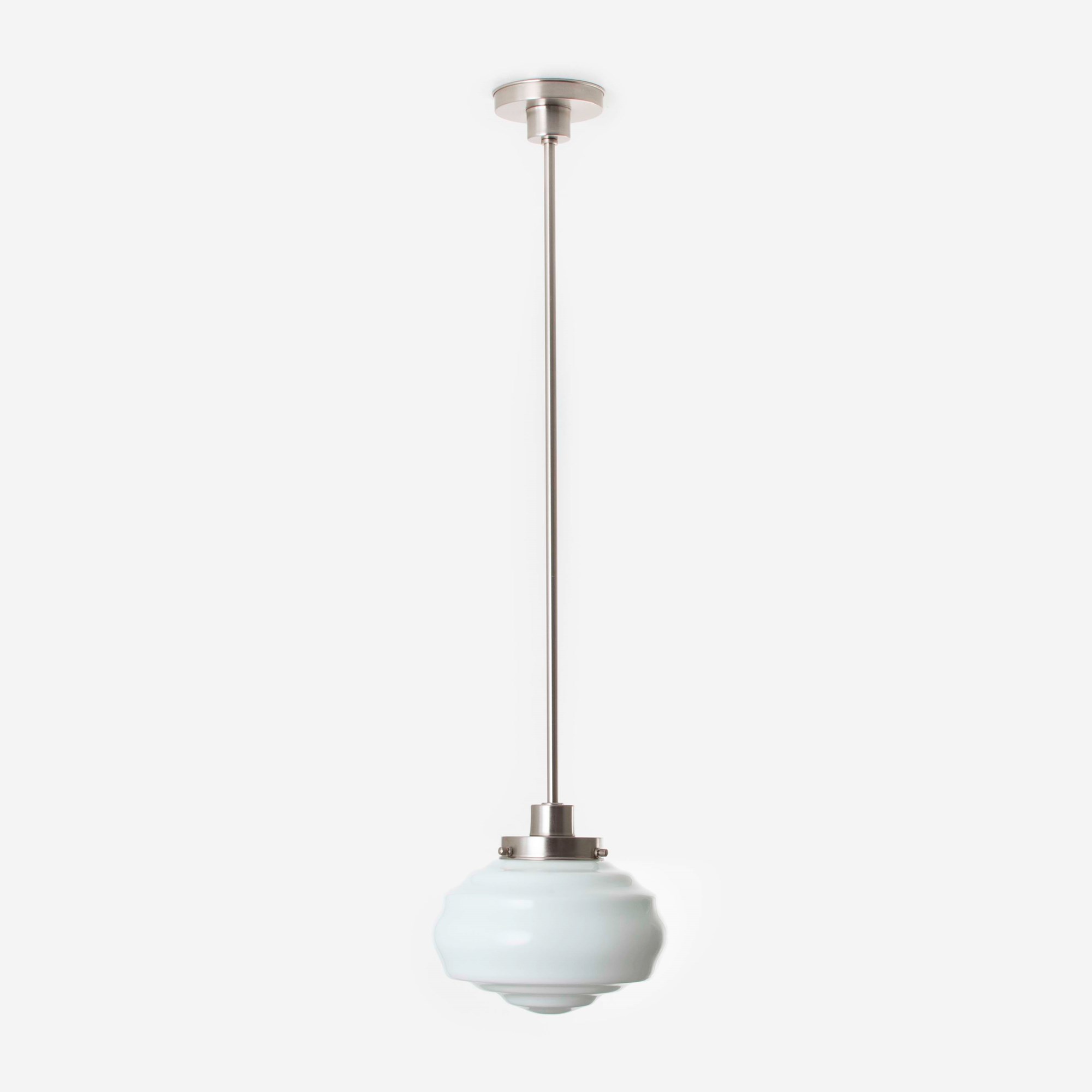 Large abat-jour en verre soufflé à la bouche avec des accents horizontaux. Verre blanc opale.