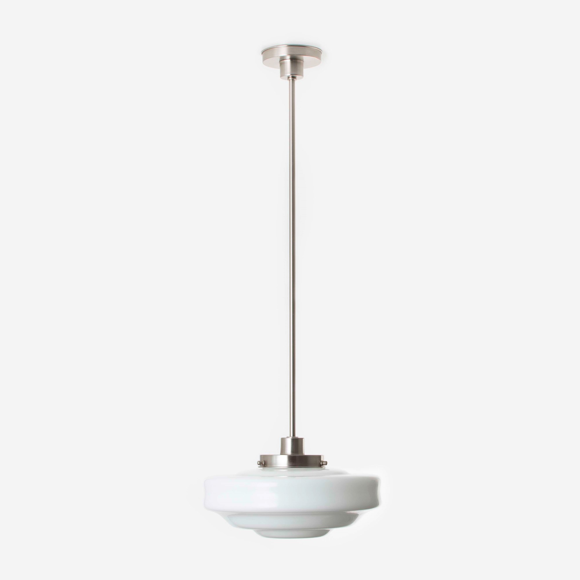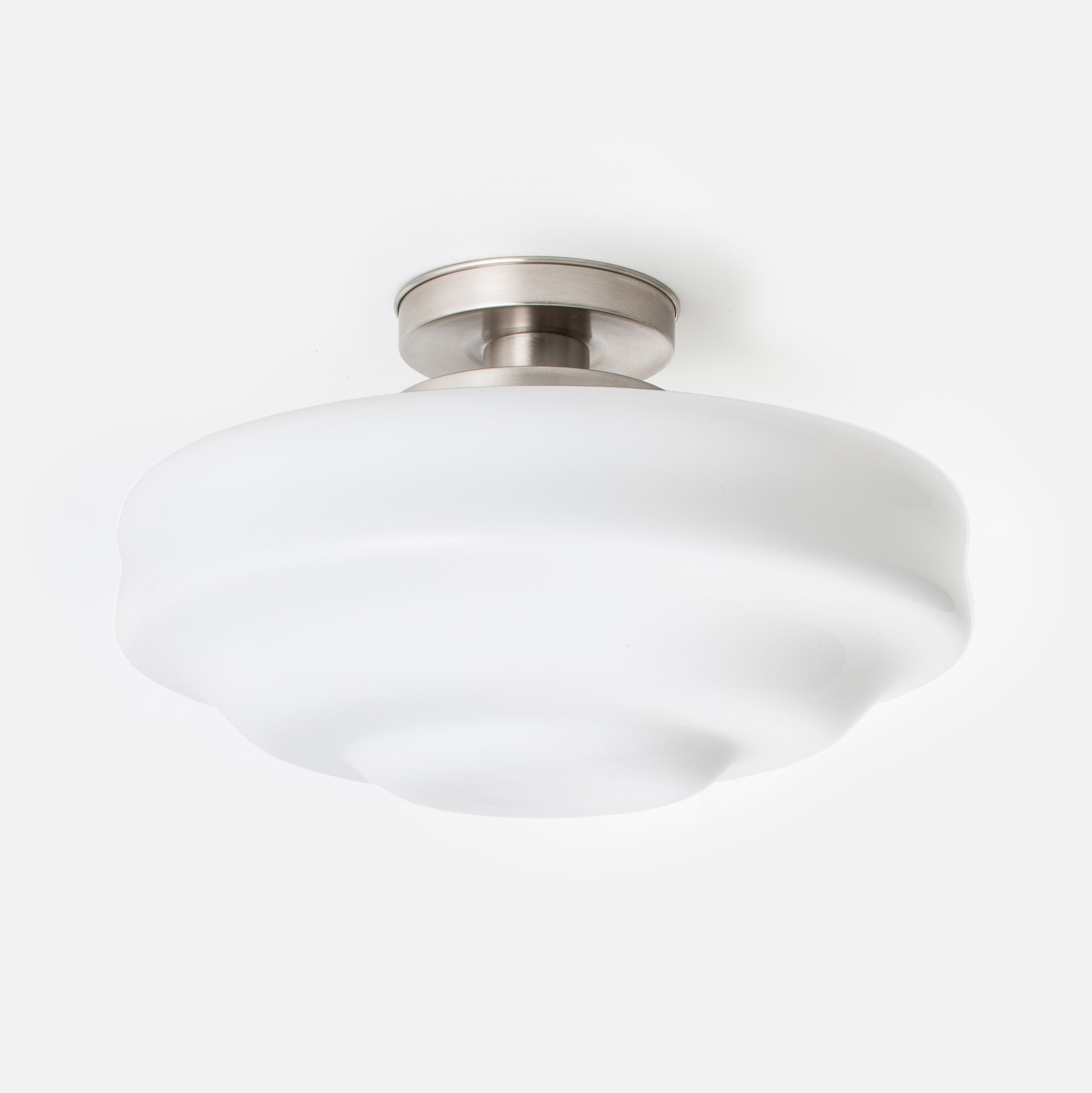Abat-jour en verre horizontal de forme ludique, aux coins arrondis. Soufflé à la bouche en verre blanc opalin.
