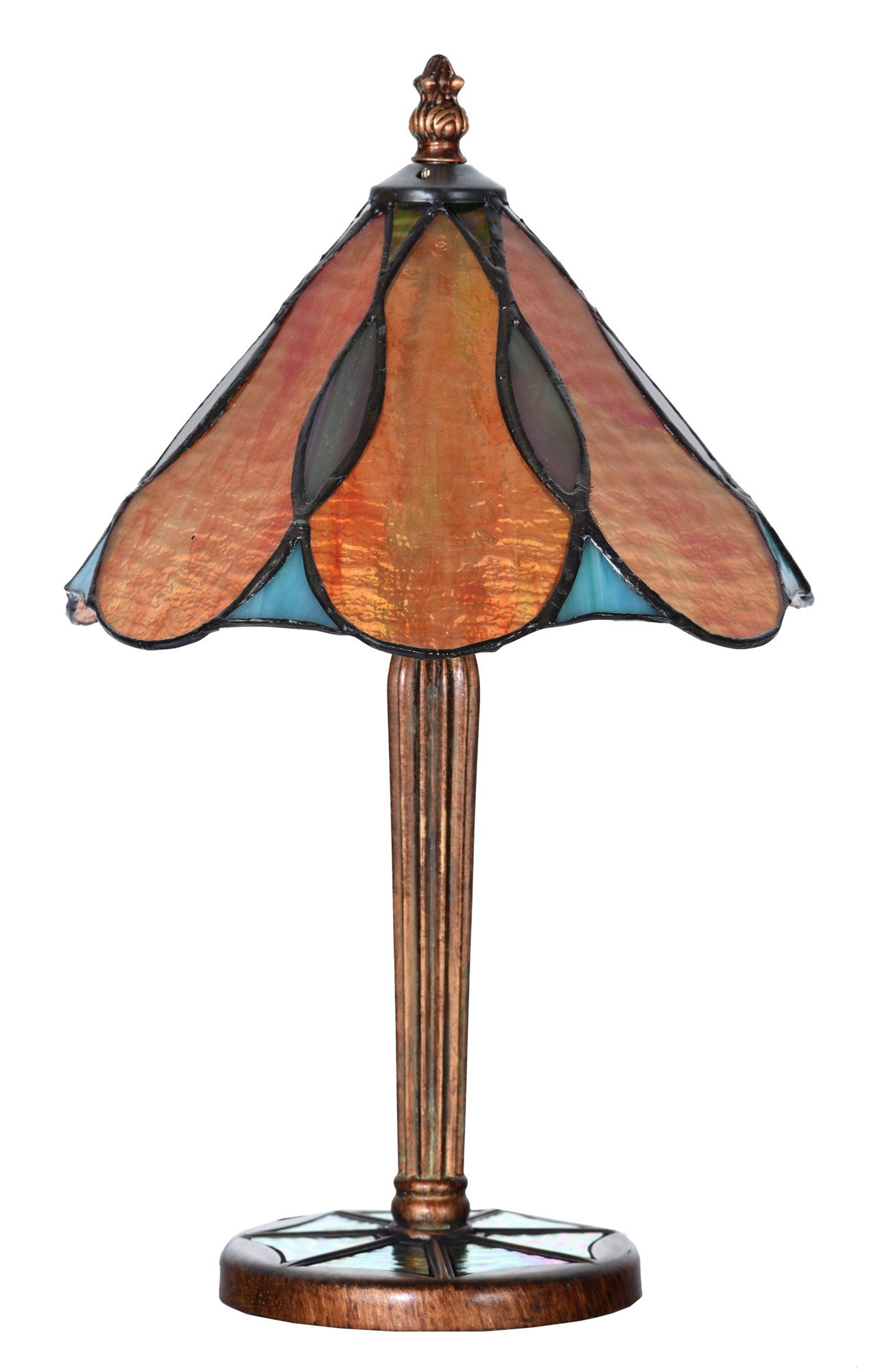 Les vitraux semblent éclairer l'obscurité. Un thème magnifique qui se reflète également dans cette lampe. Le verre de la lampe de table Gaudí possède une brillance incomparable, reconnaissable même aux pierres précieuses. L'abat-jour en verre Tiffany est spectaculaire : les couleurs froides et chaudes du bleu, du vert, du jaune, du rouge et du violet se marient harmonieusement, telle une aquarelle, créant un effet ornemental. La base de la lampe, en patine cuivrée chaude (polystone), est ornée d'une incrustation de verre vert aux reflets violets irisés, évoquant une mosaïque où la rosace se répète. La pièce finale, telle un pinacle organique (il suffit d'observer l'architecture de Gaudí), est une touche finale parfaite.