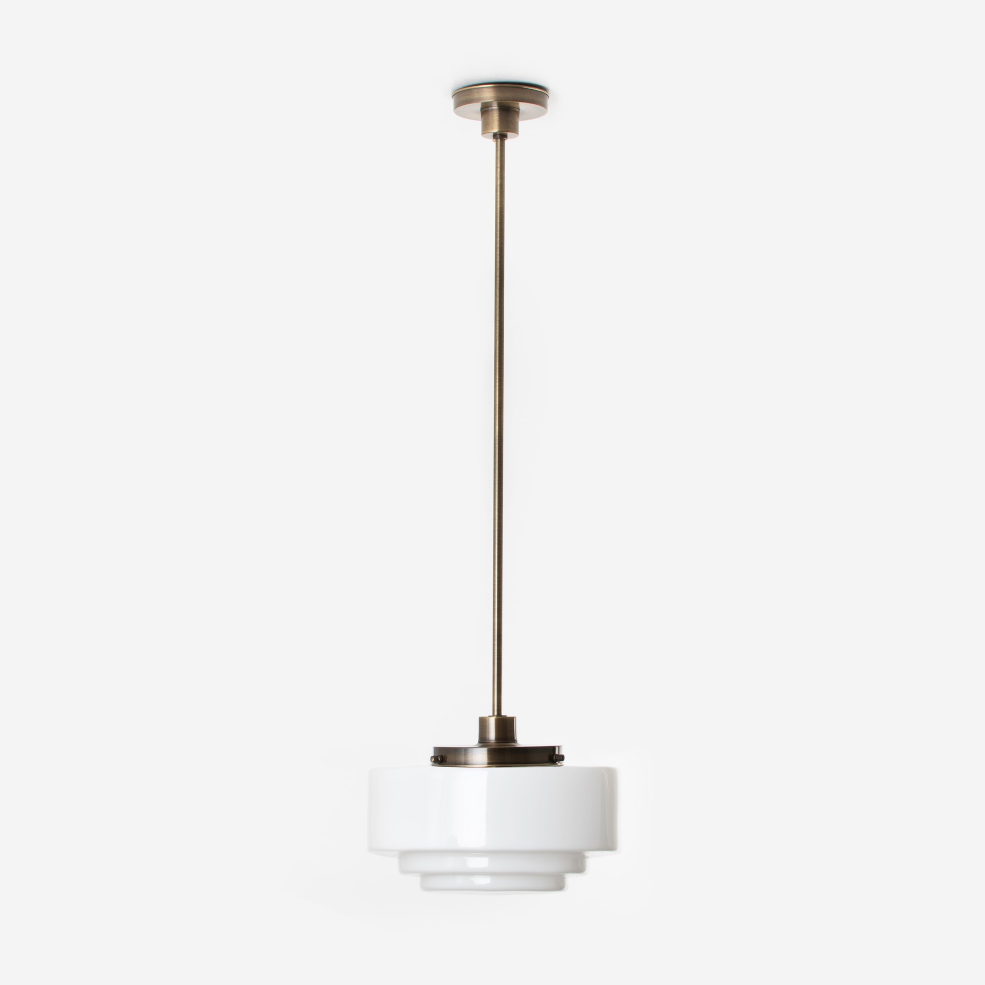 Une forme typique de l’ Art déco: un abat-jour en verre avec un large escalier en haut et de subtiles couches stratifiées en bas. Soufflé à la bouche en verre blanc opalin.