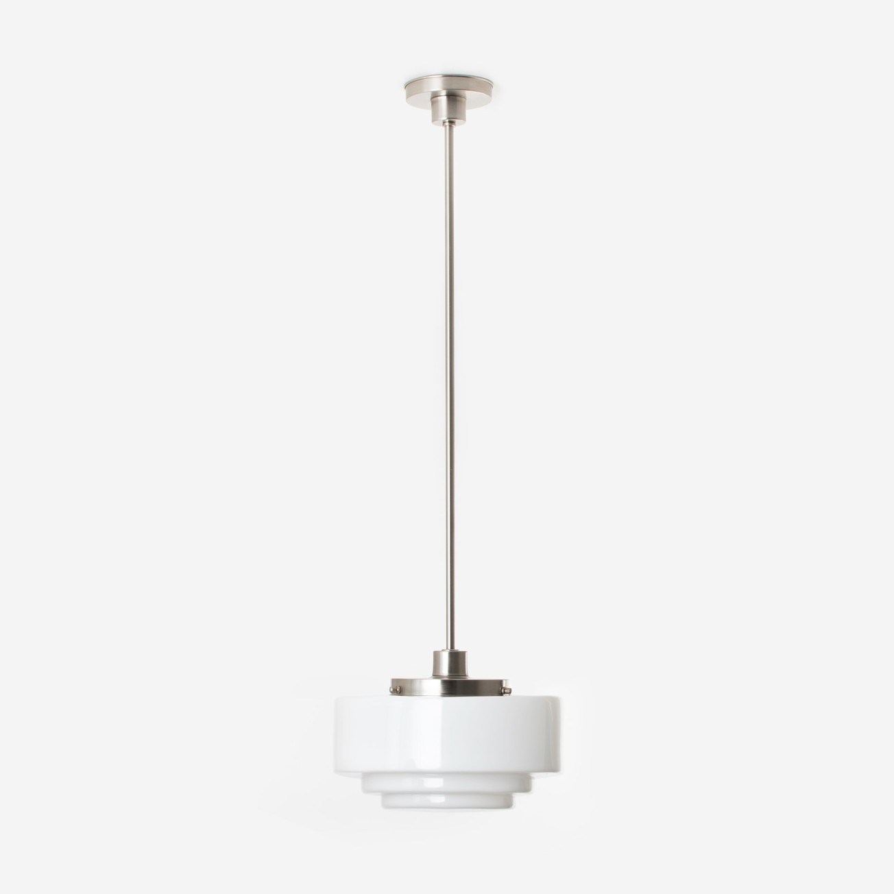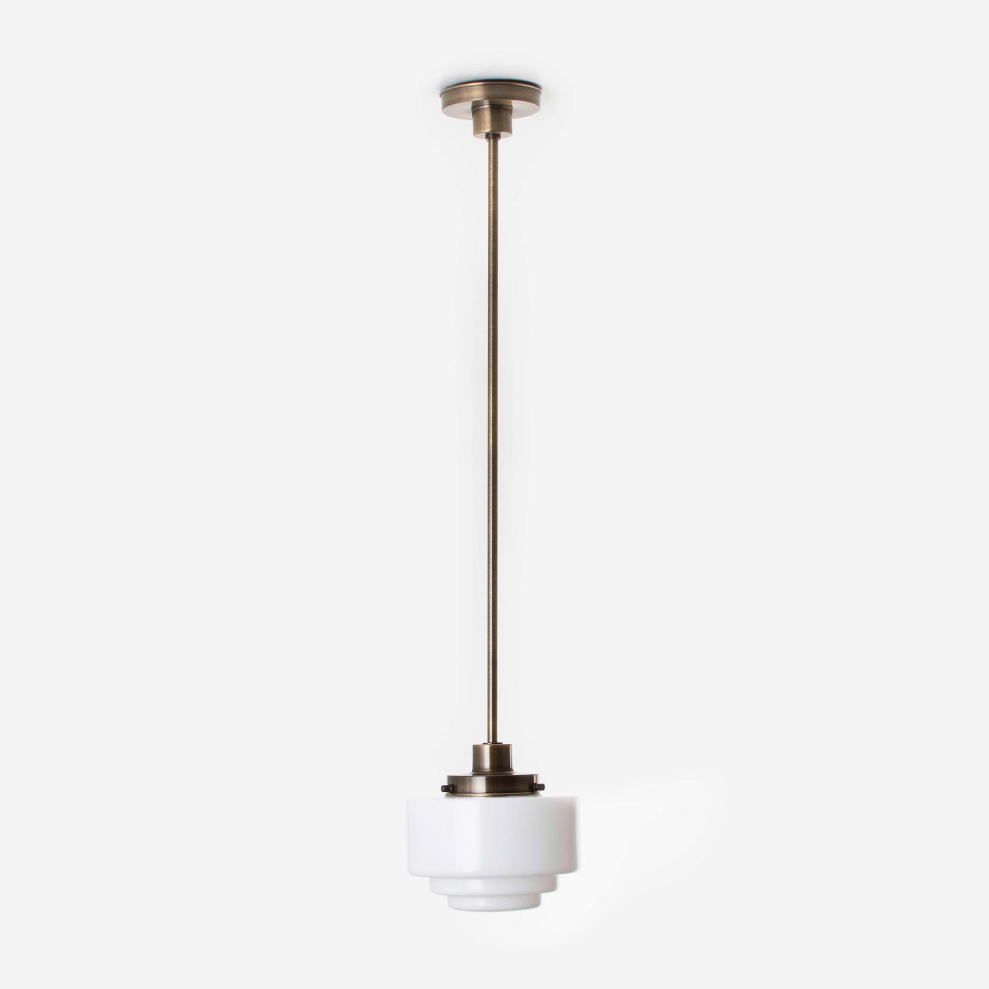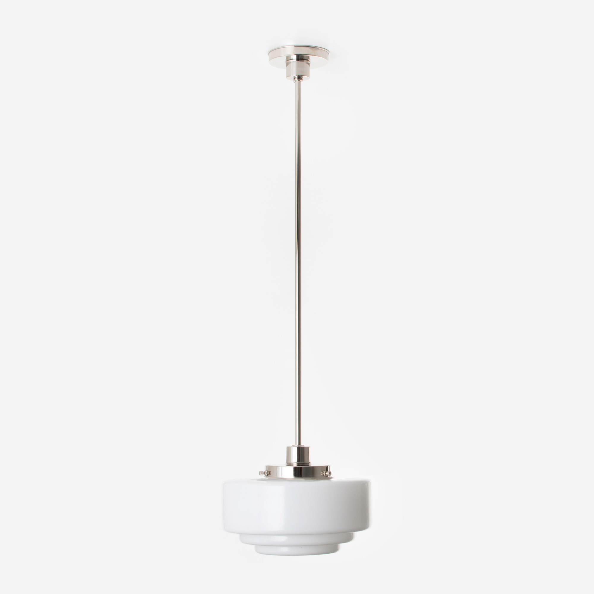 Une forme typique de l’ Art déco: un abat-jour en verre avec un large escalier en haut et de subtiles couches stratifiées en bas. Soufflé à la bouche en verre blanc opalin.
